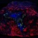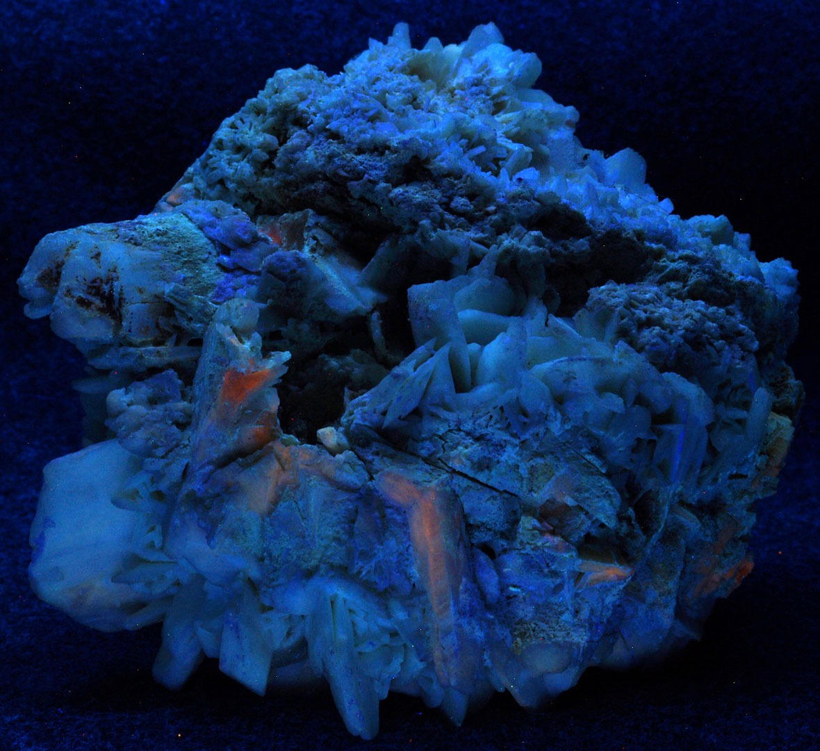 - Description: A very sharp 2-way specimen, a mound of snowy-white crystals which fluoresce in a ghostly blue-white with areas of a peachy orange...