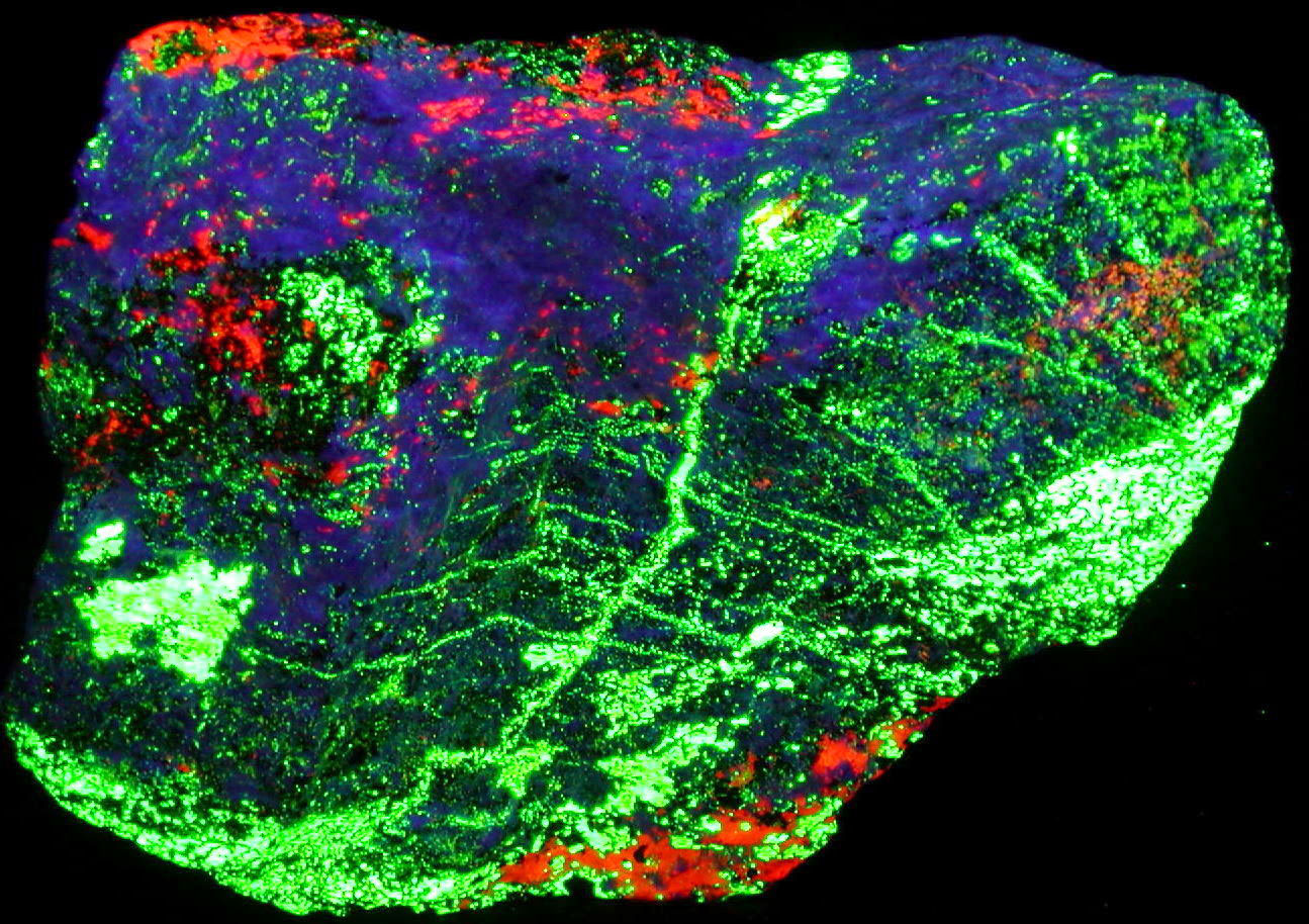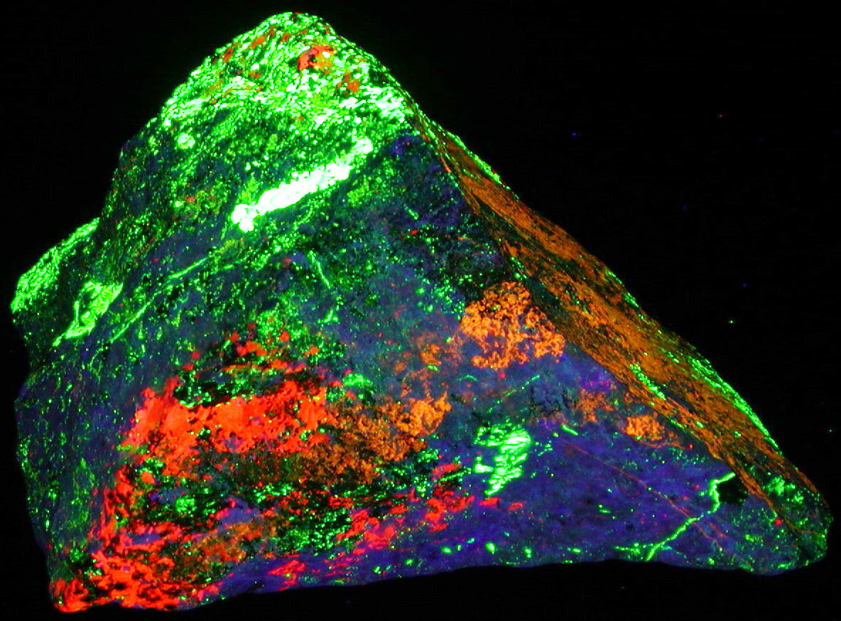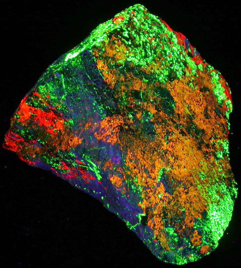- Description: An exceptional huge 4-color Hardystonite specimen, with enough Clinohedrite, Willemite, and Calcite to make it sizzle - a centerpiece for any fluorescent display