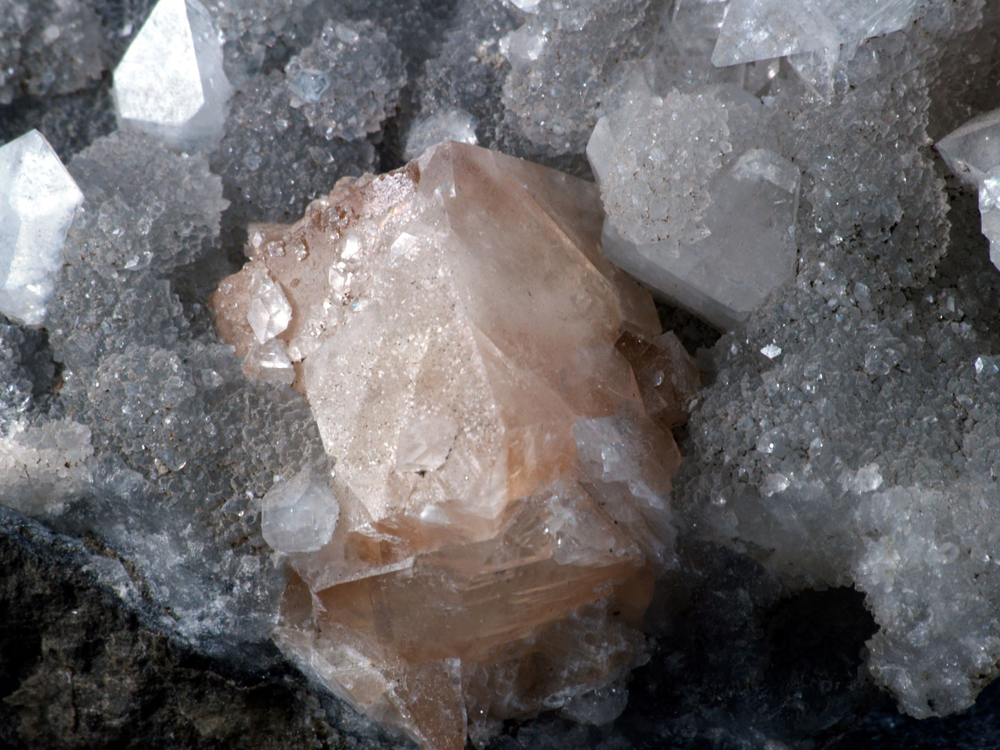 - Description: Large rare Calcite rhomb and a few glassy Apophyllites on drusy Chalcedony