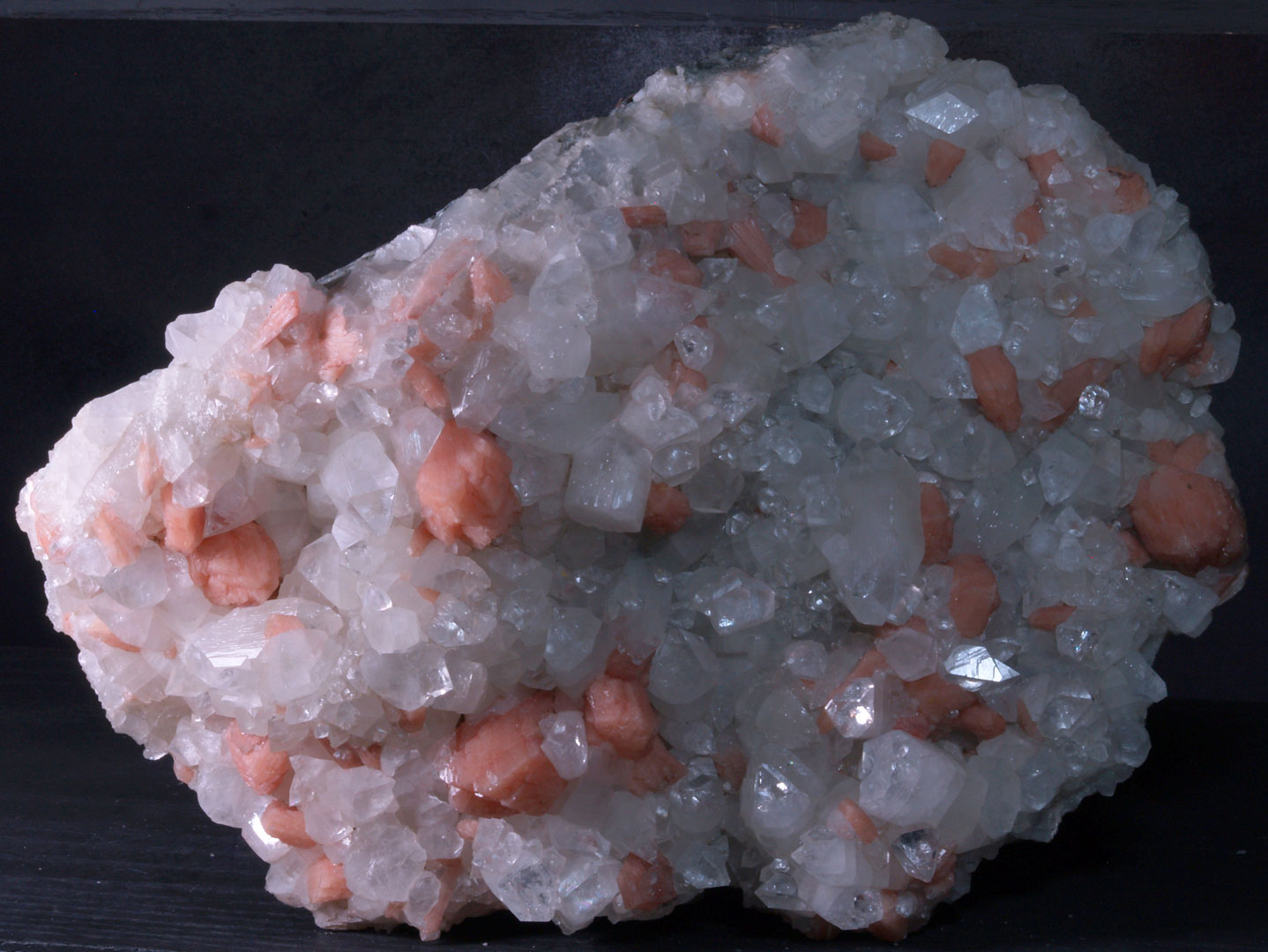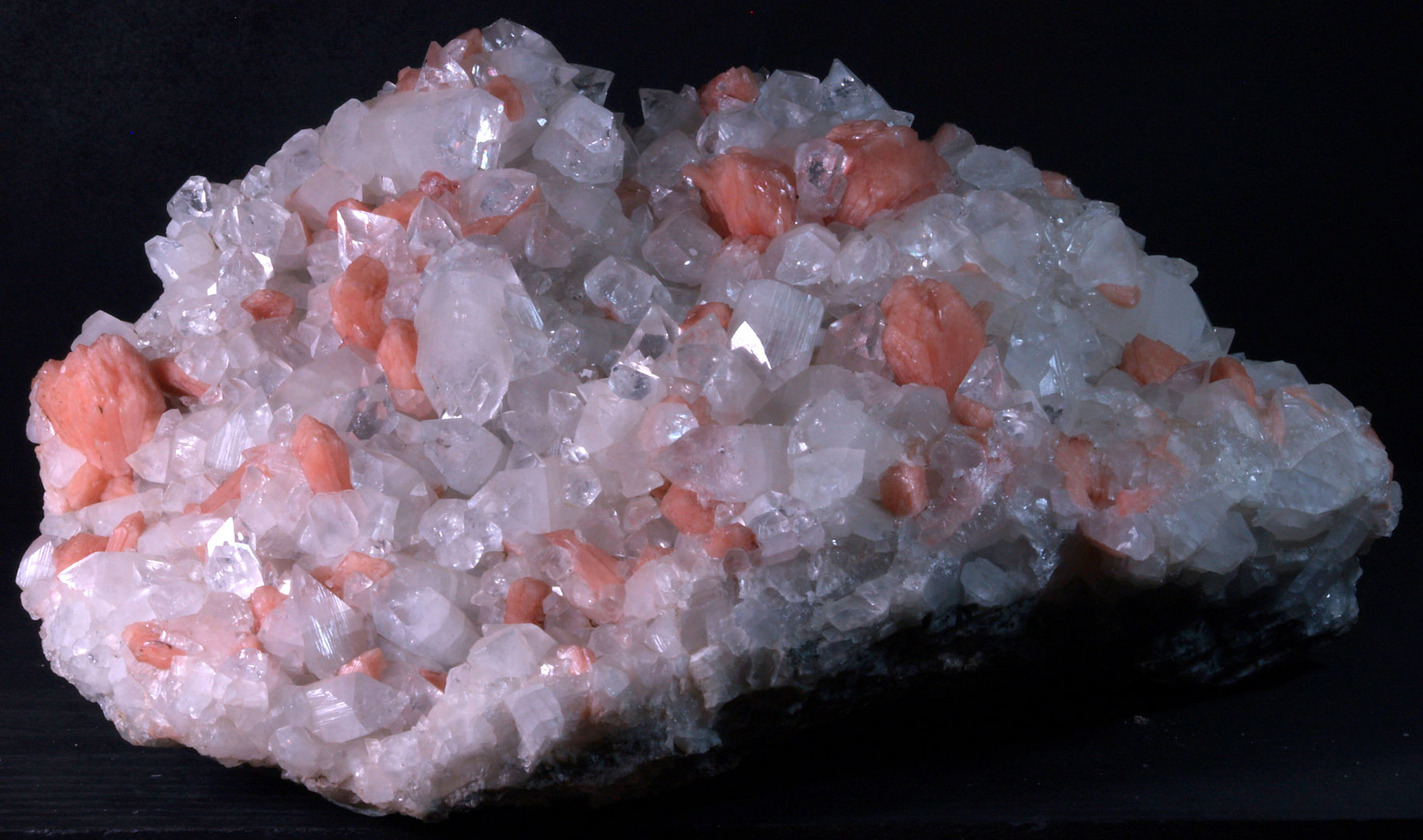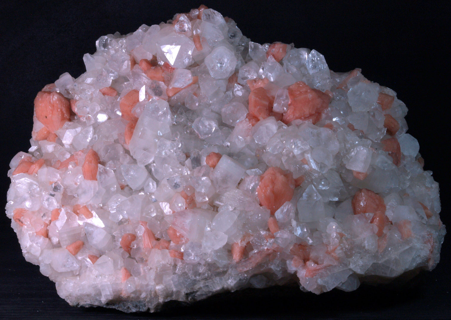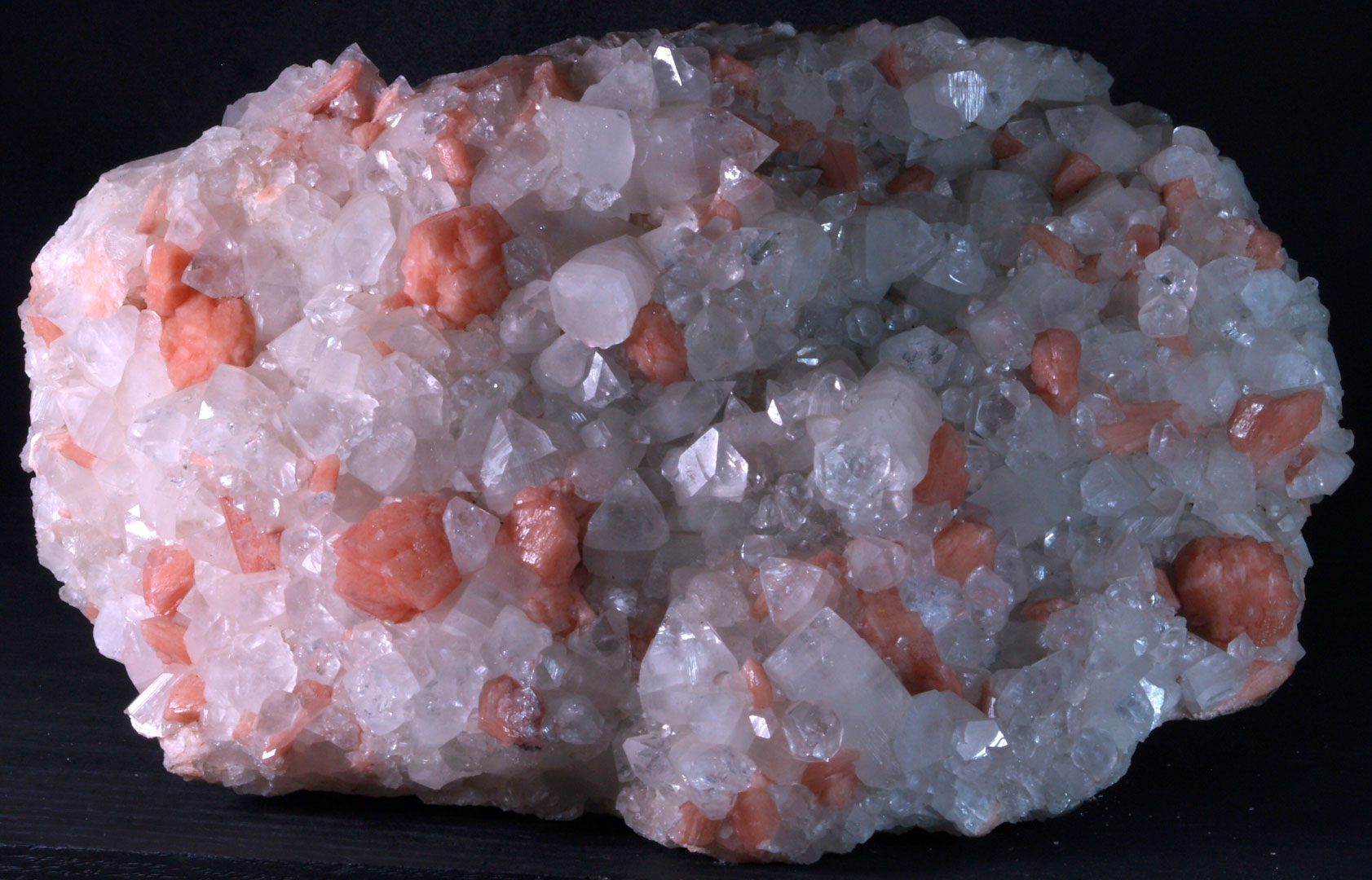 - Description: A huge sparkling plate of Apophyllite crystals, sprinkled here and there with salmon-colored Stilbites...