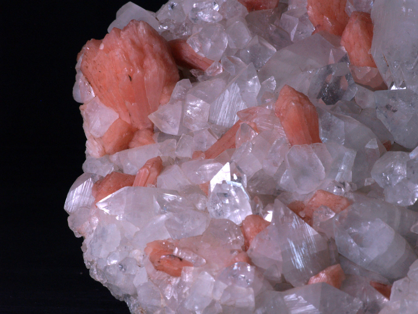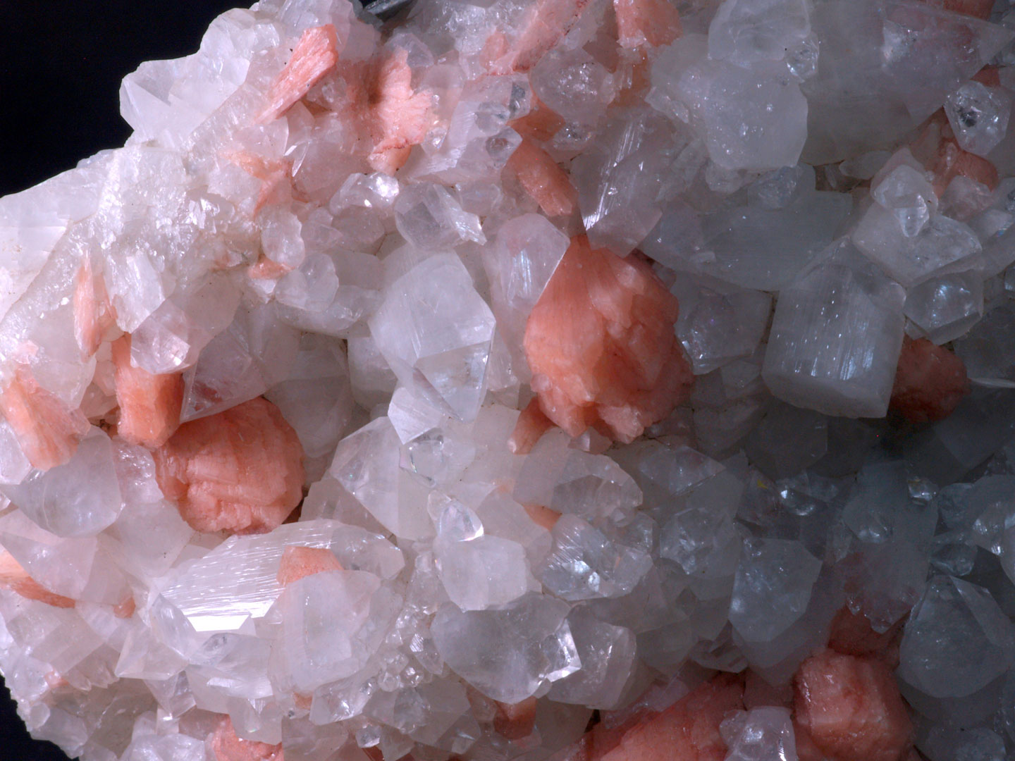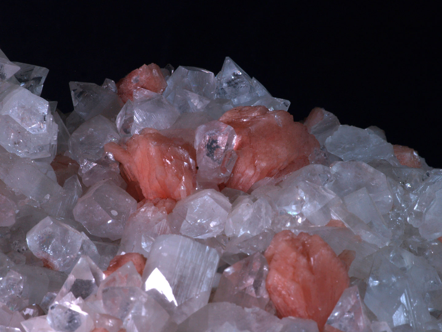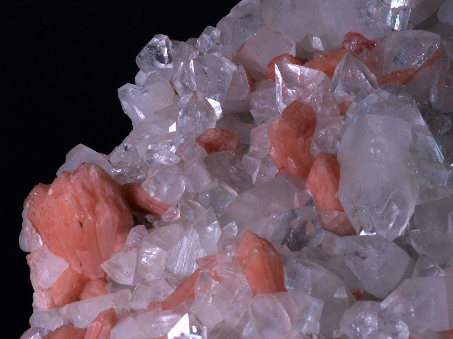 - Description: A huge sparkling plate of Apophyllite crystals, sprinkled here and there with salmon-colored Stilbites...
