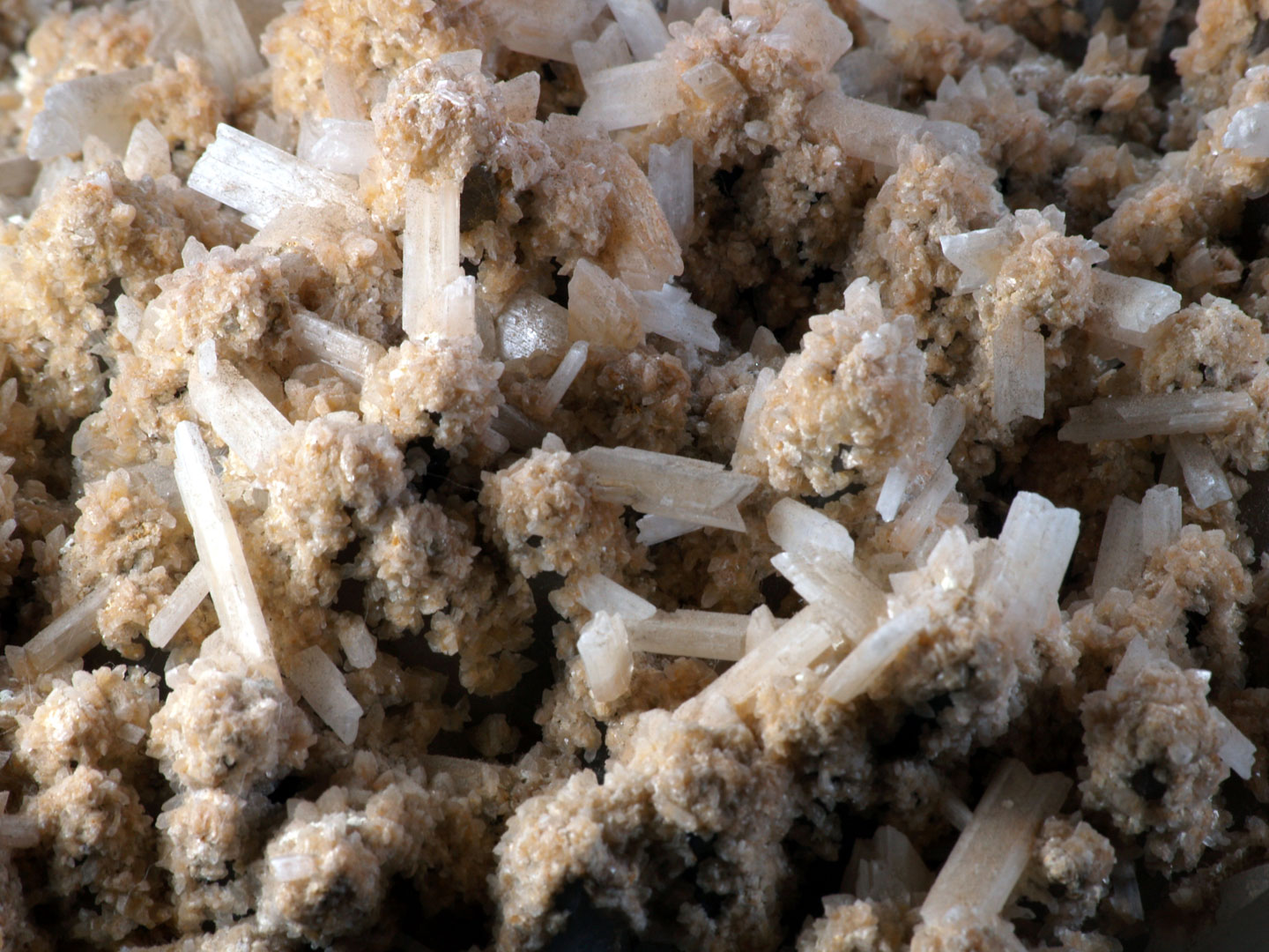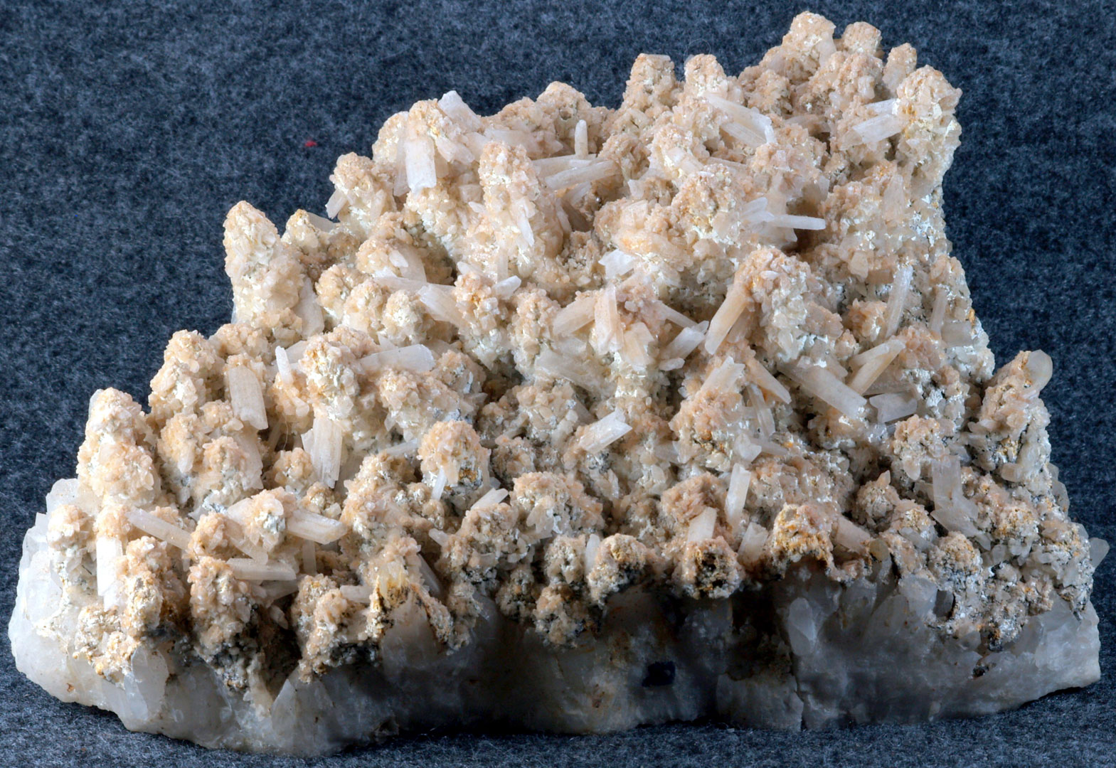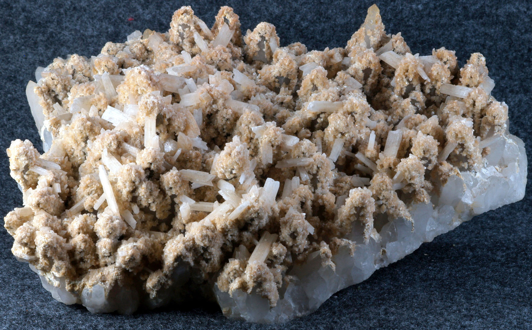 - Description: A plate of Quartz crystals to 1 in., overlaid with a golden druze (more Quartz?), with a collection of sharp 1/2 in. fish-tail Selenites scattered all over it
