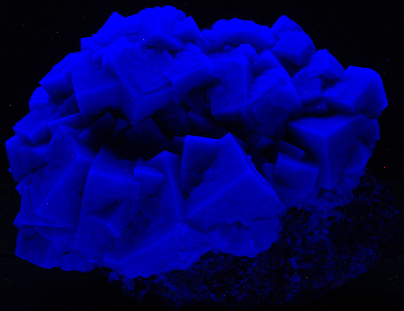 - Description: A beautiful arrangement of large undamaged xls. to 1 1/2 in. - "daylight fluorescence" is particularly strong in this specimen...