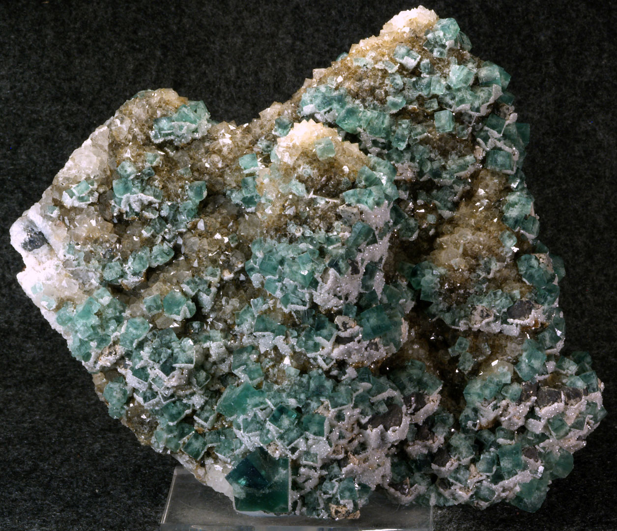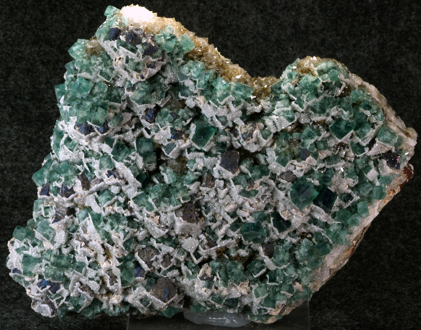 - Description: A 2-sided plate of Fluorite and Galena xls. on a sparkly Quartz matrix - currently mounted vertically on a plastic base....