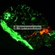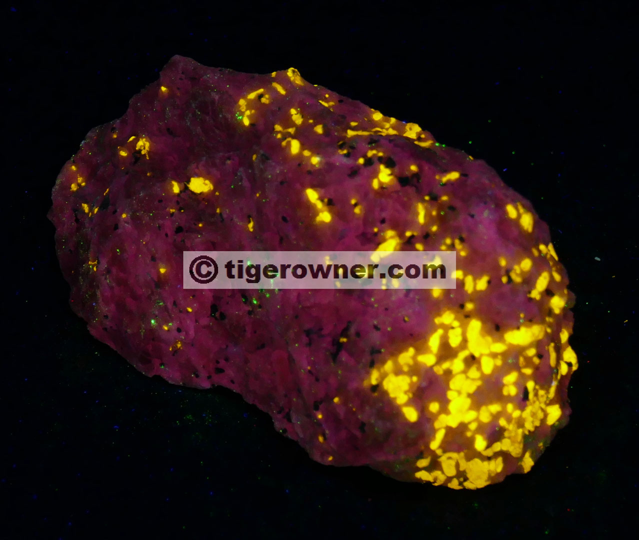 Nice example under S/W UV: bright yellow Wollastonite in red Calcite...
